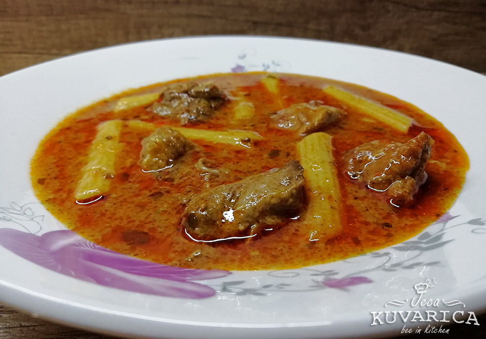 Kuvajte sve dok meso potpuno ne omekša. Pred kraj ubacite senf, kečap i kašičicu suvog povrća. Ukoliko je potrebno posolite. Dodajte makarone i kuvajte još 5 min na laganoj vatri a zatim sklonite sa šporeta.