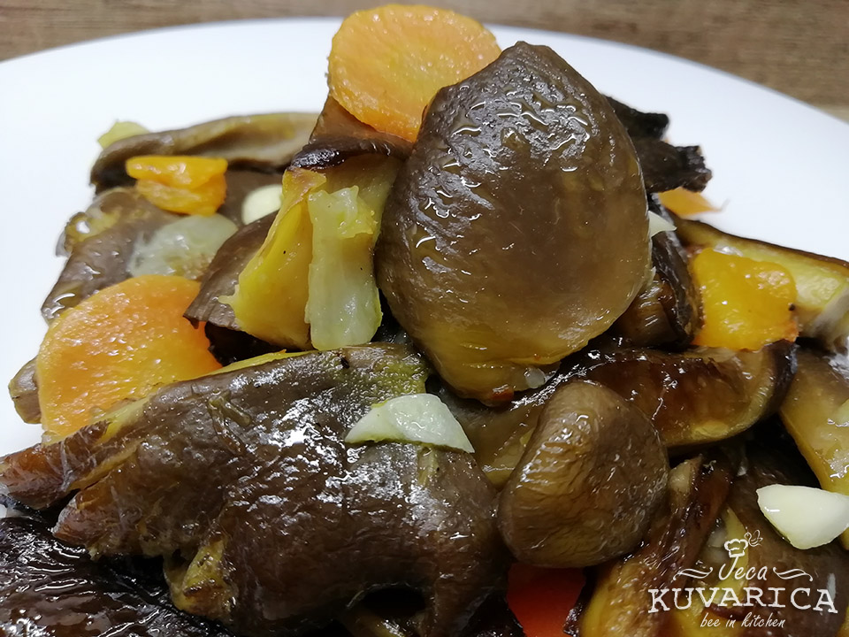 Bukovače očistite i iscepkajte na trake, sitnije neka ostanu cele. Nalijte šolju ulja u tiganj. Crni luk i papriku isecite na kockice, šargarepu na kolutove i zajedno sa bukovačom dinstajte na vrelom ulju. Začinite solju i mešavinom suvih začina i povremeno promešajte. Kada je bukovača omekšala, dodajte iseckani beli luk, promešajte i sklonite sa vatre.