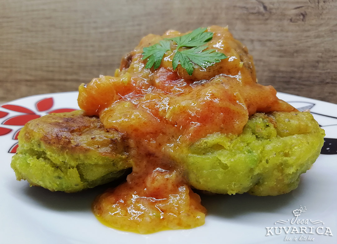 Šargarepu i crni luk očistite i isecite na kockice ili usitnite u secku. Polovinu stavite u šerpu sa graškom, nalijte vodu, dodajte malo soli i kuvajte. Kada je grašak skuvan sklonite sa šporeta. Ostavite da se prohladi a zatim procedite i usitnite štapnim mikserom. U dobijenu smesu dodajte brašno, sodu bikarbonu, senf, peršun, kurkumu i biber. Dobro promešajte, vadite ćuftice kašičicom i pržite na vrelom ulju. Kada su sve ćuftice ispržene pripremite sos.