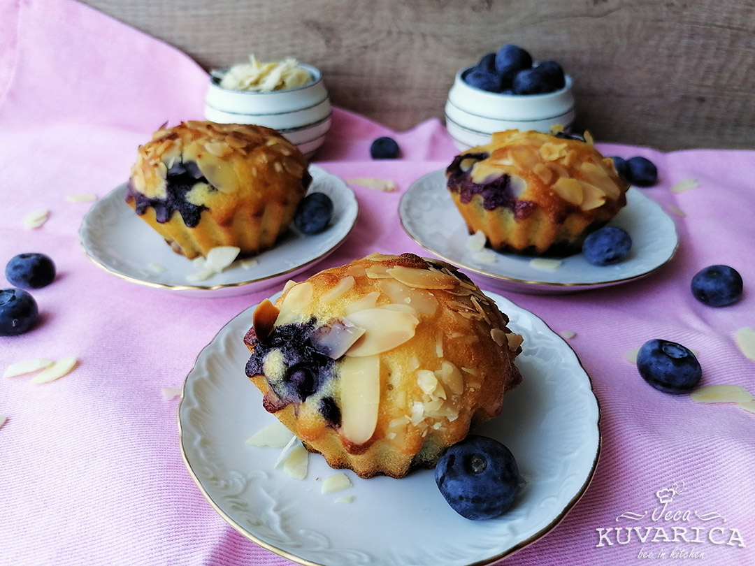 Žicom za mućenje ulupajte jaja, dodajte šećer i vanilin šećer, zatim grčki jogurt i ulje. U brašno umešajte prašak za pecivo i dodajte u jaja. Dobro promešajte i na kraju dodajte borovnice i listiće badema. Malo listića badema odvojite za posipanje.
