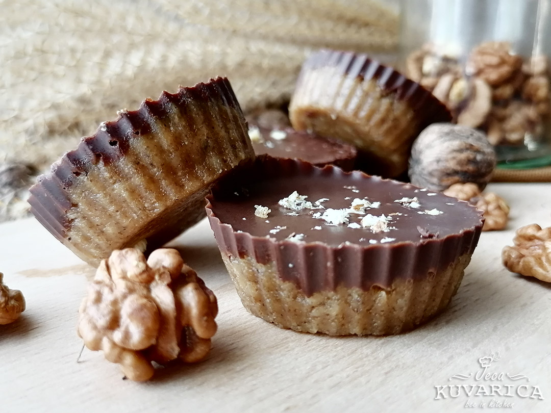 Orahe, kikiriki puter i med stavite u blender ili secka i sameljite. Zatim smesu rasporedite u silikonski kalup za mafine. Otopite čokoladu i kokosovo ulje i prelijte korpice.