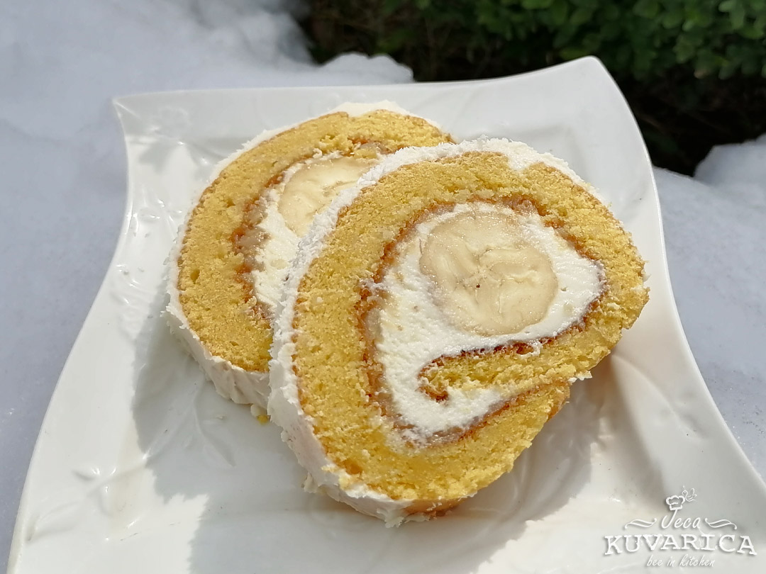 Koru odmotajte, uklonite papir za pečenje, premažite pekmez, zatim premažite 2/3 fila, poređajte banane duž ivice i pažljivo ponovo urolajte. Odozgo premažite preostali fil, pospite kokosovo brašno i stavite u frižider da se stegne bar 2-3h a najbolje preko noći.