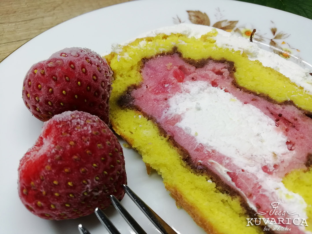 Umutite jaja sa šećerom i vanilinim šećerom, dodajte jednu po jednu kašiku vrele vode i nastavite sa mućenjem lagano povećavajući brzinu. Kada je penasto umućeno isključite mikser i umešajte brašno i prašak za pecivo. Kašikom sjedinite i smesu prebacite u pleh obložen papirom za pečenje. Ostavite nekoliko minuta da odstoji a zatim ubacite u zagrejanu rernu na 200 stepeni i pecite 10min. Kada je kora ispečena izvadite tepsiju iz rerne i koru prebacite na radnu površinu a zatim je urolajte sa sve papirom u suvu kuhinjsku krpu.