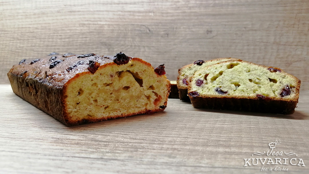 Na kraju umešajte brašno sa praškom za pecivo i brusnice. Lagano promešajte da se smesa sjedini.