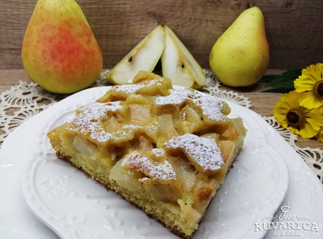 Kruške operite, ogulite i iseckajte na kockice. Pobacajte kockice krušaka na površinu kolača a zatim ubacite tepsiju u unapred zagrejanu rernu.