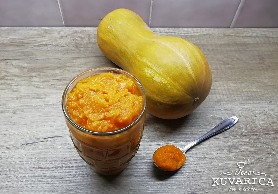 Bundevu operite a zatim je prepolovite i ogulite. Očistite je od semenki i isecite na sitne komade. Komadiće stavite u šerpu, nalijte vode da prekrije komade i kuvajte na tihoj vatri. Nakon pola sata proverite viljuškom da li je bundeva skuvana. Skuvanu bundevu ocedite od viška vode i izblendajte.