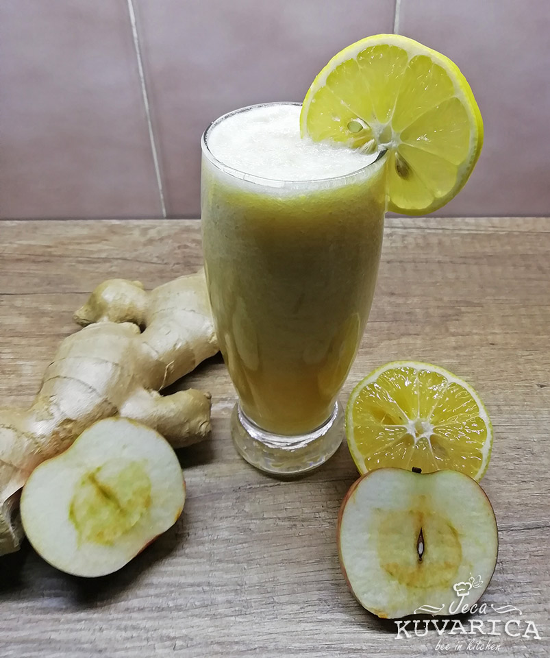 Oljuštite jabuku i iseckajte je na komade. Limun iscedite. 1,5 cm đumbira oljuštite i izrendajte. Pripremljene sastojke ubacite u blender i dodajte med i pola šolje vode. Izmiksajte dok ne dobijete homogenu smesu. Sipajte u čašu.