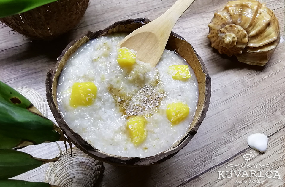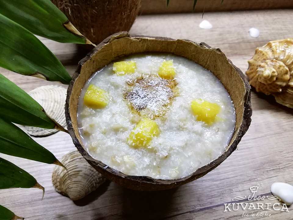 Stavite pahuljice u šerpu sa vodom da prokuvaju. Nakon 5 minuta sklonite i u vruće umešajte kokosovo brašno i aromu vanile. Zasladite medom, dodajte kockice manga i pomešajte.