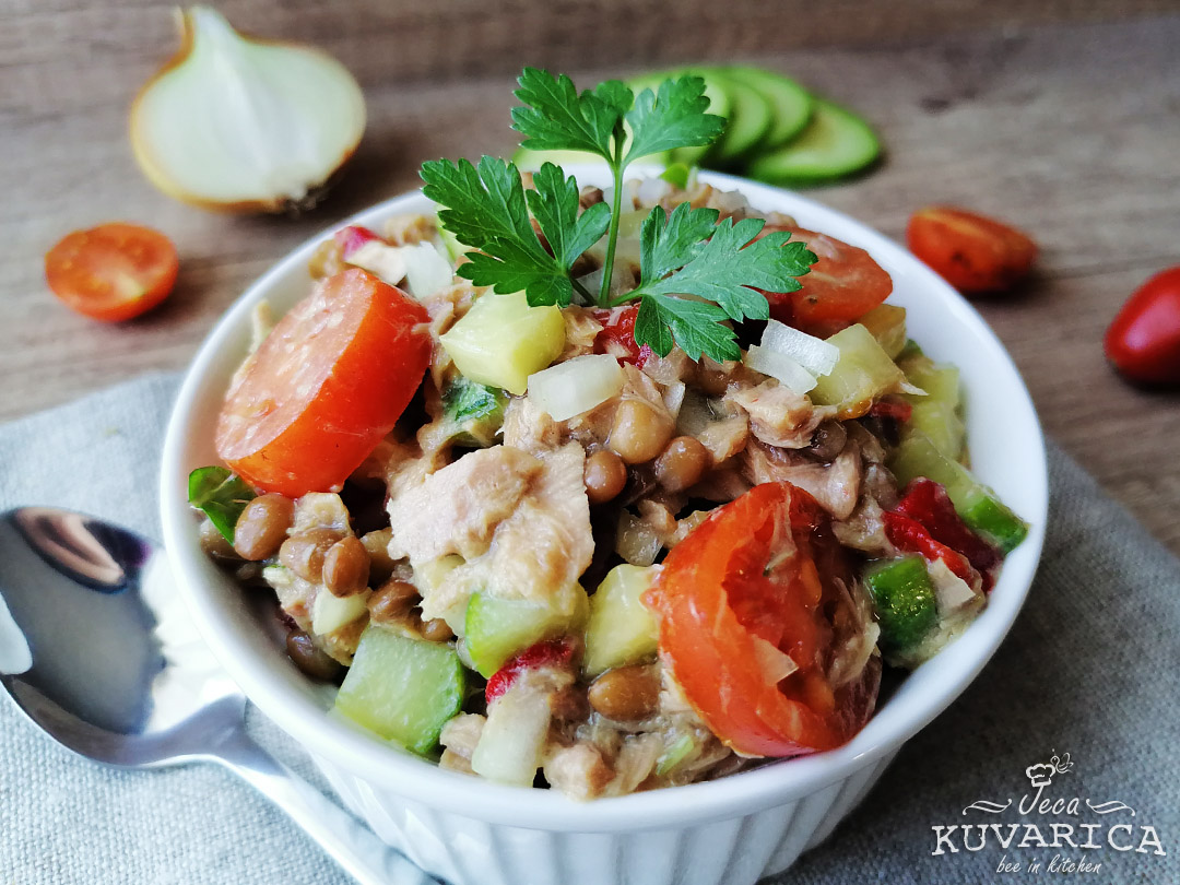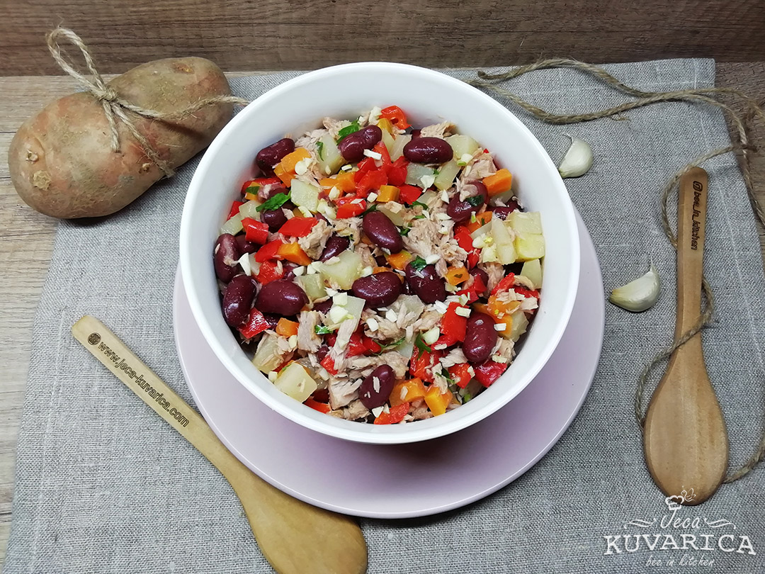 Dodajte so i biber po ukusu, malo limunovog soka ili jabukovo sirće, malo belog luka u granulama i promešajte. Na kraju dodajte oceđenu skušu iz konzerve i pažljivo promešajte.