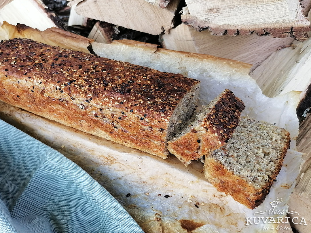 Četkom i vodom premažite hleb, pospite semenke i pecite u rerni na 200 stepeni oko pola sata.