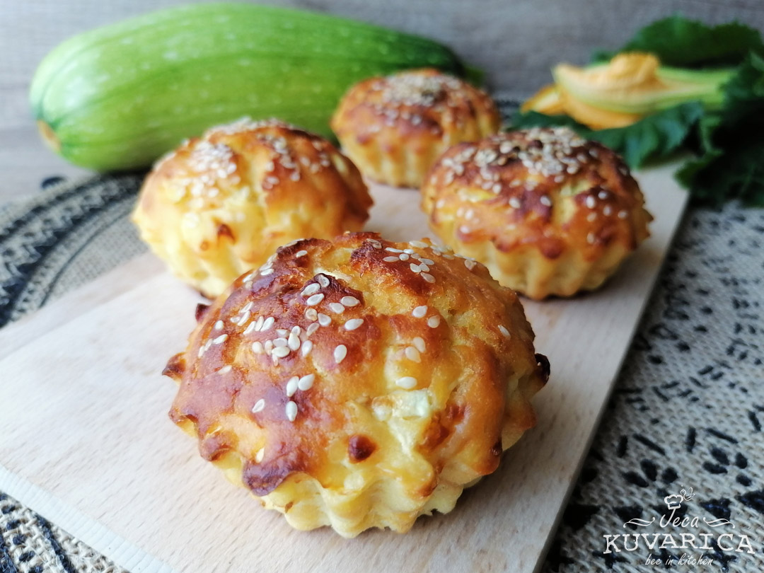 Umutite jaja, dodajte jogurt, ulje, rendani sir i rendane tikvice. Dobro promešajte i dodajte brašno koje je pomešano sa praškom za pecivo. Još jednom promešajte i sipajte smesu u silikonski kalup za mafine. Za silikonski kalup nisu potrebne papirne korpice. Odozdo pospite susam i ubacite u zagrejanu rernu.