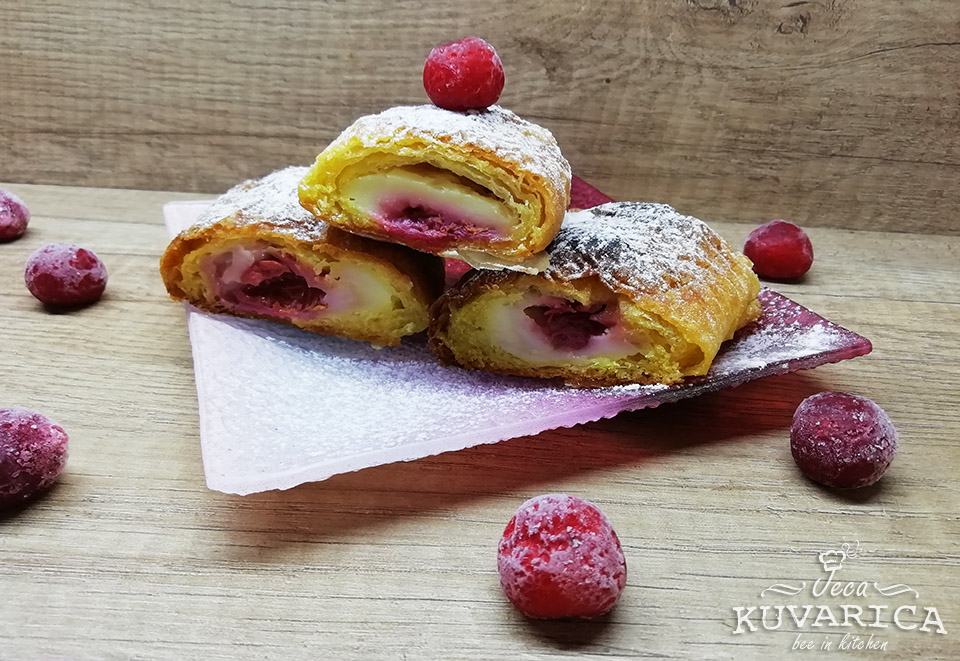 Uvijte u rolat i stavite u tepsiju na pek papiru. Ponovite postupak sa preostalim materijalom. Isecite rolate na parčad, pecite u zagrejanoj rerni na 200 stepeni oko pola sata.