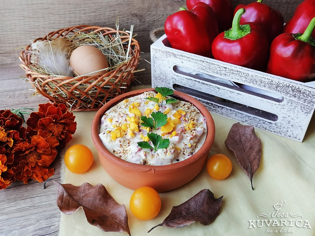 Pečene paprike oljuštite i isperite a zatim ostavite da se ocede. Majonez, kiselu pavlaku i senf sjedinite. Ubacite oceđene paprike, iseckano ili izrendano kuvano jaje, susam, seckani peršun, so, šećer i beli luk.
